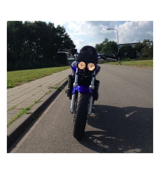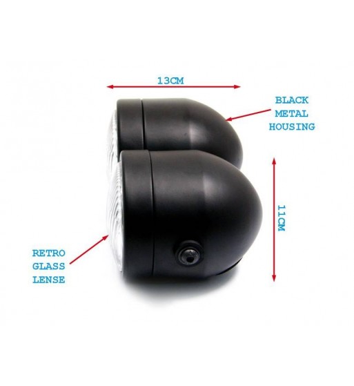 Doppelscheinwerfer, matt schwarzes Gehäuse, Abblend- und Fernlicht, 2 x H4 12V 55 / 60W, Metallgehäuse, seitliche Montage, Durchmesser 218 mm, Tiefe ab Gewinde 60 mm, mit Standlichtung.Seitlich angebracht