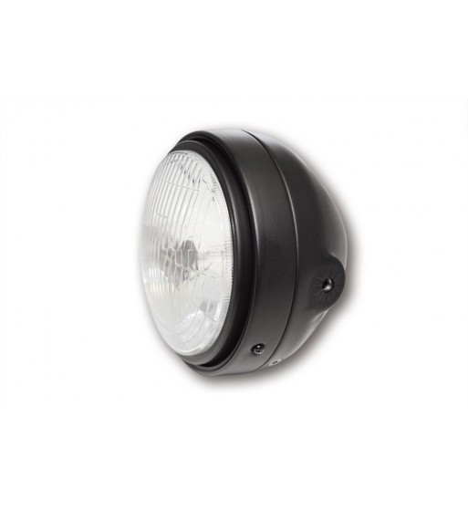 Mit Standlicht Funktion und seitlichen Befestigungspunkten. H4-Hauptscheinwerfer in einem schwarz-matt Metallgehäuse mit einstellbarem Innenring und geriffeltem Glas. Der Scheinwerfer verfügt über einen asymmetrischen - nur für den Rechtsverkehr zugelassenen - Reflektor und Standlicht, E-geprüft.