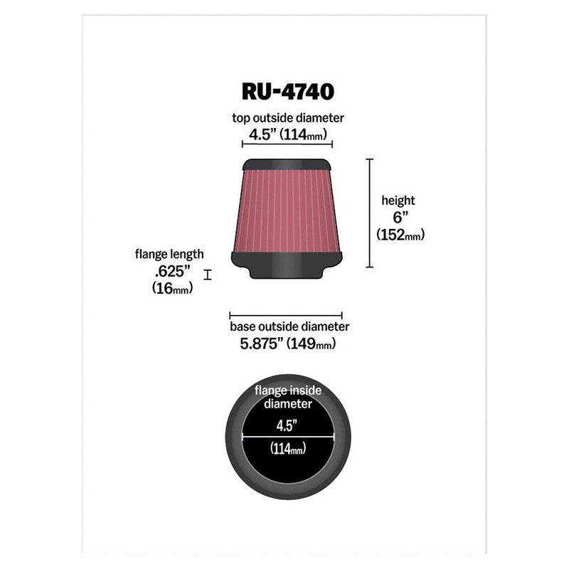 All filters are made with ultra-durable, molded, flexible rubber flanges that absorb vibration and provide a secure fit. They can also be extended up to 1.5 mm (1/16 inch) to accommodate intermediate sizes. K&N universal air filters are washable and reusable.