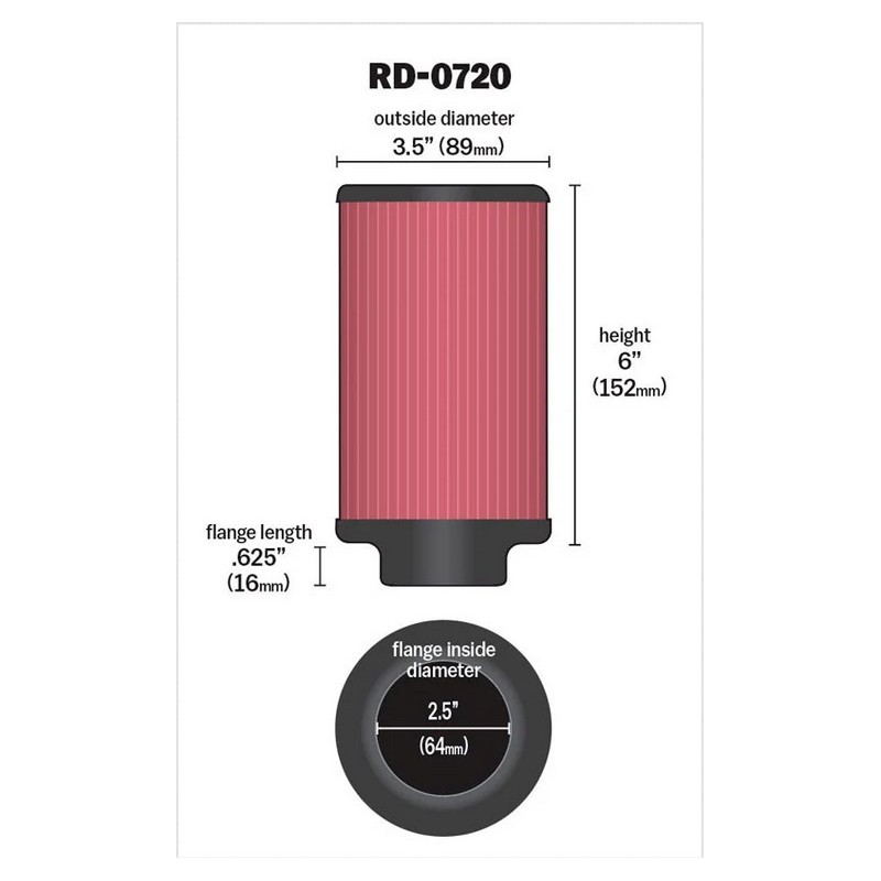 All filters are made with ultra-durable, molded, flexible rubber flanges that absorb vibration and provide a secure fit. They can also be extended up to 1.5 mm (1/16 inch) to accommodate intermediate sizes. K&N universal air filters are washable and reusable.