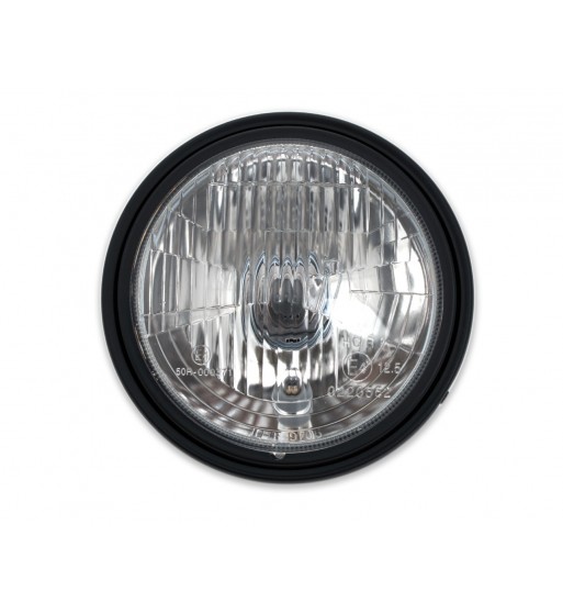 With parking light function and lateral attachment points. H4 headlamp in a matt black metal housing with adjustable inner ring and ribbed glass. The headlamp has an asymmetrical reflector and parking light, E-approved.