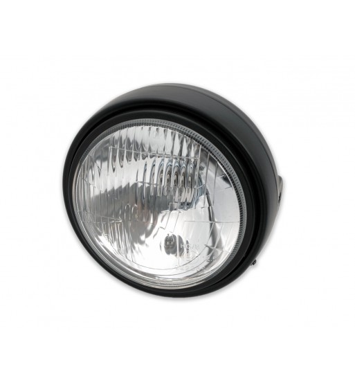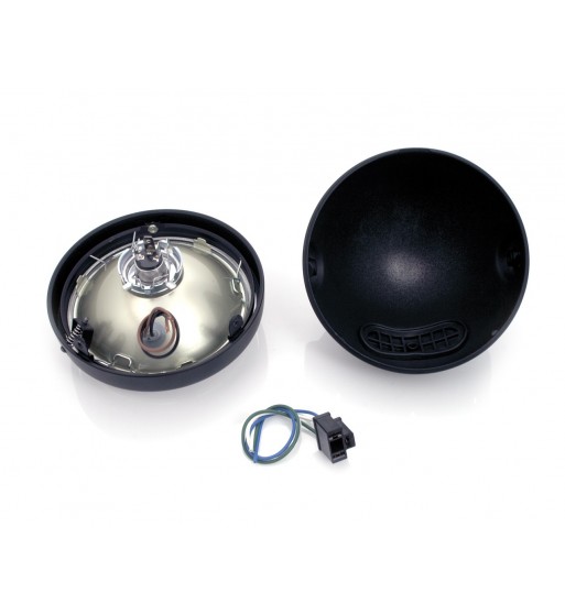 Avec fonction feux de stationnement et points de fixation latéraux. Lampe frontale H4 dans un boîtier en métal noir mat avec bague intérieure ajustable et verre strié. La lampe frontale est dotée d’un réflecteur asymétrique et d’un feu de stationnement homologués EU.