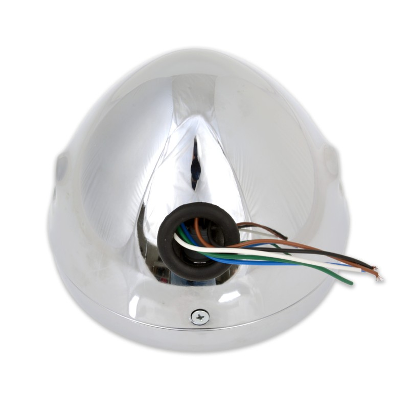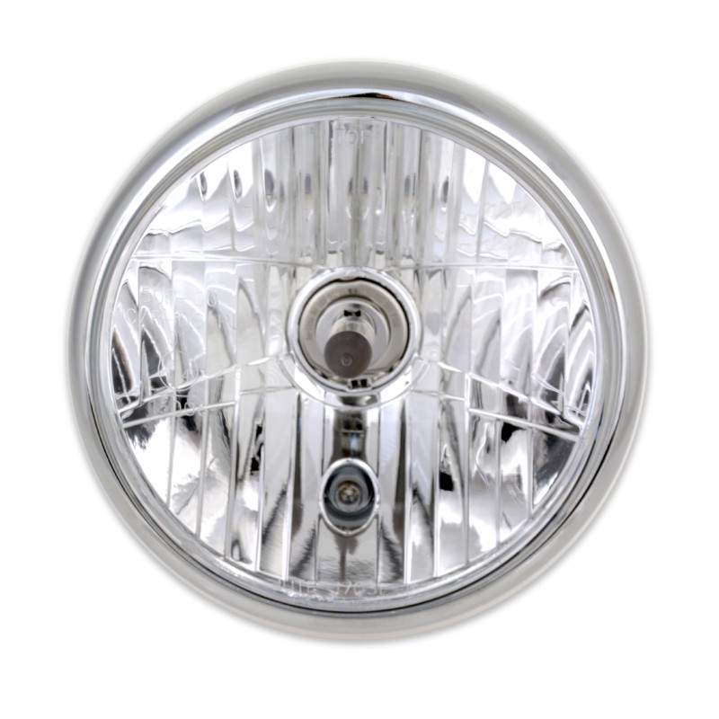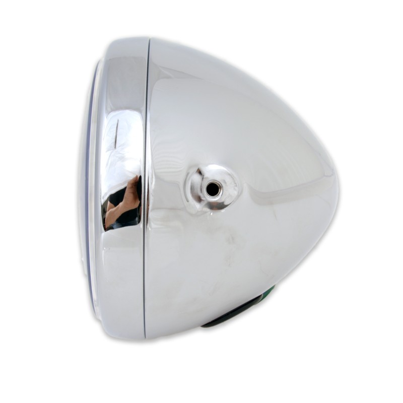 Phare en métal diamètre 190 mm. à partir du 12 v. avec ampoule H4 55/60 watts (feux de croisement/feux de route) et feu de position.Homologué E4 avec verre transparent - Corps chromé.Orifices latéraux avec trou M10